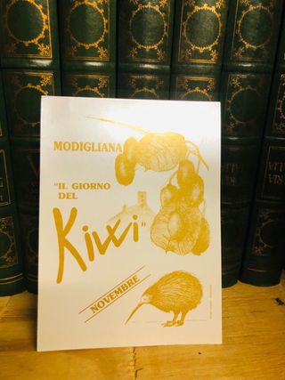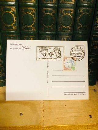 Cartolina vintage con annullo filatelico. - Modigliana, il giorno del Kiwi. - Data: 19 Novembre 1989. - Edizioni Pro Loco Modigliana.