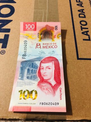 Banconota messicana da 100 pesos. - Serie: Sor Juana Ines de la Cruz. - Data: 10 Luglio 2023. - Codice: FB0620409.