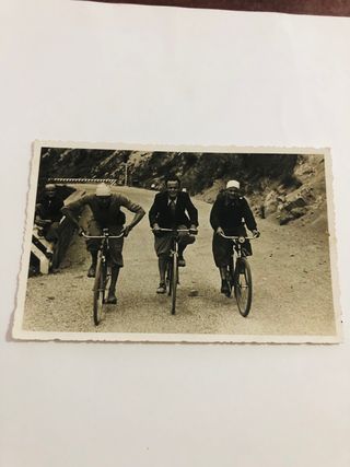 Cartolina d'epoca con una scena di tre ciclisti su una strada di montagna. - Immagine in bianco e nero. - Bordo seghettato tipico delle cartoline vintage. Misura 14x9 cm