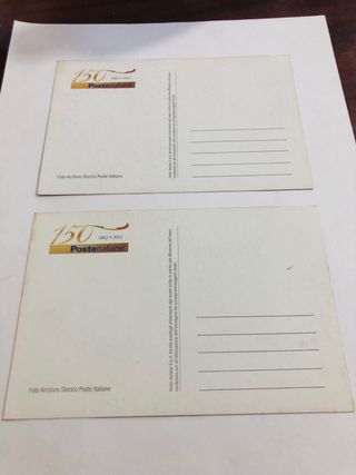 Set di cartoline celebrative per i 150 anni delle Poste Italiane. - Due cartoline vintage. - Una raffigura una coppia su scooter in città. - L'altra mostra un gruppo di motociclisti con un fotografo.