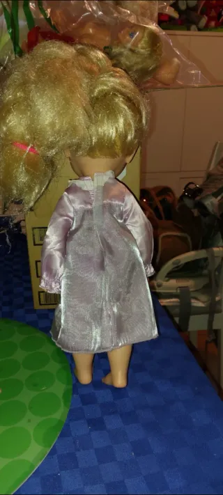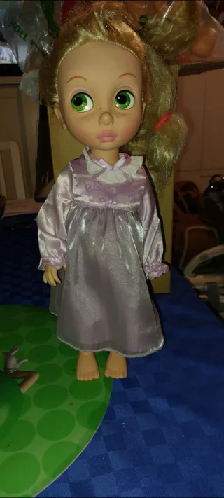 Bambola di Rapunzel Disney, con capelli biondi e occhi verdi. - Indossa un pigiamino lilla. - Dettagli ricamati sul pigiamino. - Piedi nudi. I capelli sono da sistemare, ma per il resto è perfetta