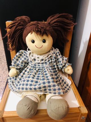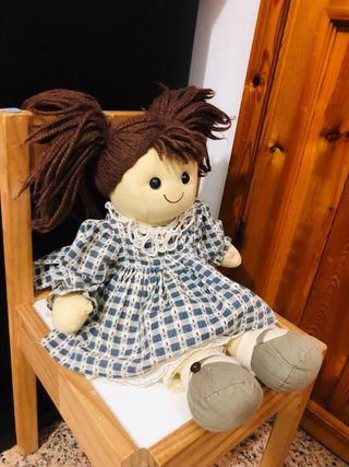 Bambola di stoffa fatta a mano, con dettagli curati. - Capelli castani raccolti. - Vestito a quadri blu e bianco con dettagli rossi. - Collo in pizzo bianco. - Calzini e scarpette abbinate. Altezza in piedi 44 cm.