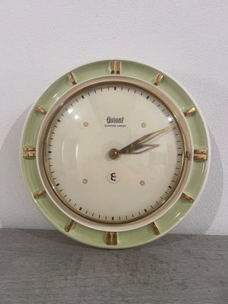 Orologio da parete vintage marca Garant. - Cornice esterna verde pastello con dettagli dorati. - Quadrante color crema con indici neri e lancette dorate. - Simbolo E stilizzato al centro del quadrante. Diametro 24 cm Parte ma si ferma da revisionate Anni 50-60 In porcellana