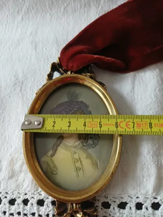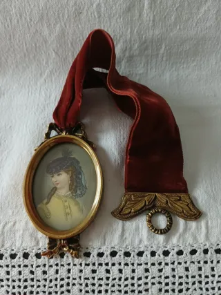 Bellissimo drappo in velluto con cornice in ottone, risalente ai primi del '900. Un pezzo d'epoca con un fascino unico. - Drappo in velluto color bordeaux. - Cornice ovale in ottone finemente lavorata. - Miniatura di una donna con cappello. - Nastro in velluto per appenderlo.