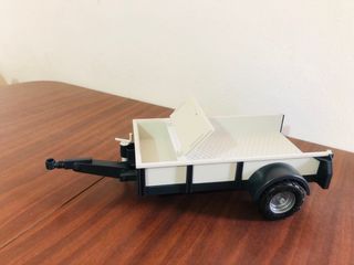 Rimorchio pianale Bruder, ideale per trasportare merci. - Colore bianco e blu scuro. - Ruote nere con cerchioni argentati. - Timone di aggancio nero. Anno 2002. Manca la porta posteriore.