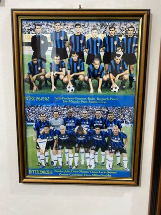Bellissimo quadro celebrativo dell'Inter con le squadre delle stagioni 1964/1965 e 2009/2010. - Squadra 1964/1965: Sarti, Facchetti, Guarneri, Bedin, Burgnich, Picchi, Jair, Mazzola, Peirò, Suarez, Corso. - Squadra 2009/2010: Pandev, Julio Cesar, Maicon, Chivu, Lucio, Samuel, Zanetti, Cambiasso, Eto'o, Milito, Sneijder.