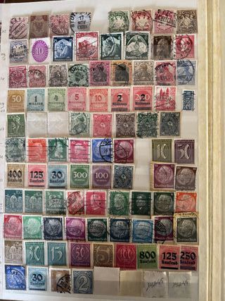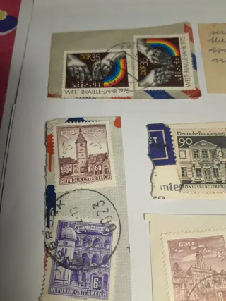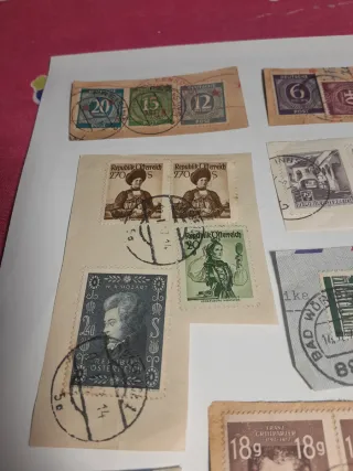Collezione di francobolli antichi, principalmente dalla Germania e Austria. Vari design e valori. Alcuni francobolli mostrano immagini di edifici e ritratti. Include francobolli con valori di 70, 20, 12, 35, 40 e 100. Lotto di 11 a 8 €, ogni pezzo di carta a 1 €