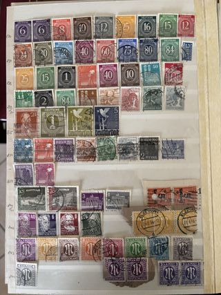 Collezione di francobolli antichi tedeschi. Vari design ed epoche. Include francobolli con immagini di edifici e paesaggi. Alcuni francobolli presentano timbri di cancellazione. Lotto di 10, a 7€, ogni pezzo a 1€