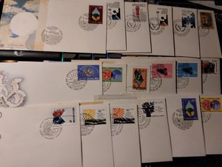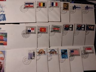 Lotteria di 18 buste commemorative del Primo Giorno di Emissione delle Nazioni Unite. Ogni busta presenta francobolli di diversi paesi ed eventi. Include francobolli di Jugoslavia, Guinea, Francia, Panama, Vietnam, Suriname, Namibia, USA e Singapore. Temi vari come bandiere, disastri e eventi storici. Ogni busta ha il timbro ufficiale del Primo Giorno di Emissione.