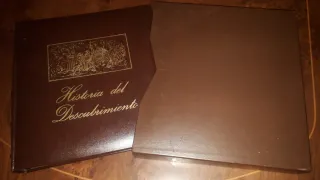 Cartella Storia della Scoperta per collezionare francobolli. - Copertina marrone. - Illustrazione dorata sulla copertina. - Testo Storia della Scoperta in dorato. 10 euro.
