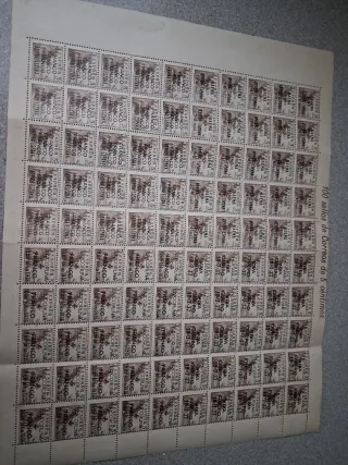 Foglio di 100 francobolli postali spagnoli, ciascuno del valore di 5 centesimi. - Francobolli commemorativi. - Temi vari. - Data di emissione: 1936 e 1937.