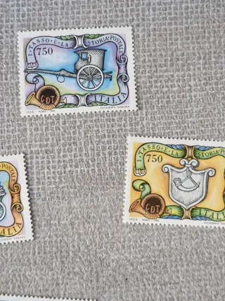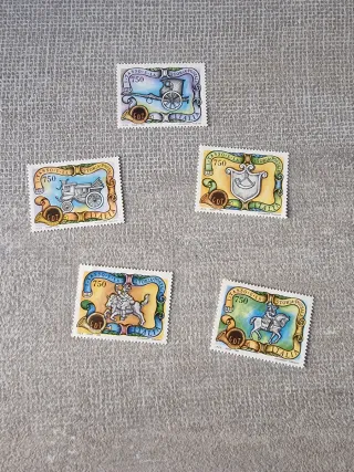 Set di 5 francobolli della Repubblica Italiana, dedicati alla Storia Postale. Nuovi in perfette condizioni - Valore nominale 750. - Raffigurano carrozze e stemmi storici. - Edizione Italia. - Include CDT su ogni francobollo.