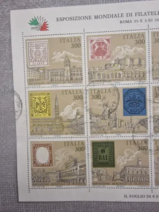 Foglietto di 9 francobolli della Repubblica Italiana. - Edizione speciale Esposizione Mondiale di Filatelia Roma 25-X 3-XI 1985. - Valore totale del foglio: L. 2700.