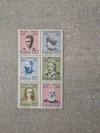 Foglietto di francobolli della Repubblica Italiana. - Matilde Serao 1856-1927 - Vittorino da Feltre 1378-1446 - Vittorio Emanuele II 1820-1878 - Pio IX Mastai Ferretti 1792-1878 - Marcello Malpighi 1628-1694 - Antonio Meucci 1808-1889