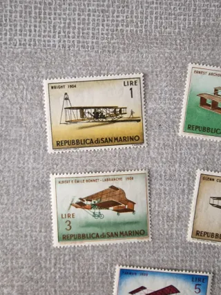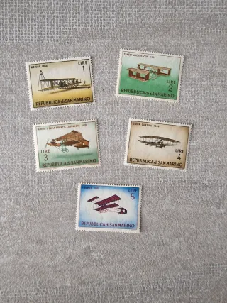 Set di francobolli della Repubblica di San Marino, nuovi. - Francobollo da 1 Lira con Wright 1904. - Francobollo da 2 Lire con Ernest Archdeacon 1907. - Francobollo da 3 Lire con Albert e Émile Bonnet-Labranche 1908. - Francobollo da 4 Lire con Glenn Curtiss 1908. - Francobollo da 5 Lire con Farman 1909.