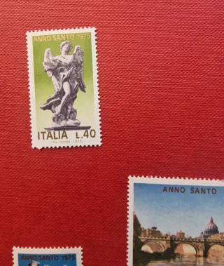 Set di francobolli della Repubblica Italiana del 1975. - Francobolli Anno Santo 1975. - Valori: L.40, L.50, L.90, L.150, L.180. - Raffigurano statue e Ponte Sant'Angelo a Roma.