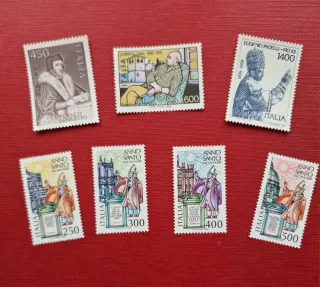 Serie di francobolli della Repubblica Italiana. - Francobollo da 450 lire con Francesco Guicciardini. - Francobollo da 600 lire con Umberto Saba. - Francobollo da 1400 lire con Eugenio Pacelli (Pio XII). - Serie di francobolli Anno Santo con valori da 250, 300, 400 e 500 lire.