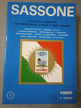 Catalogo completo dei francobolli d'Italia e Paesi Italiani, edizione 1988. - Copre Antichi Stati, Regno, R.S.I., Luogotenenza, Repubblica, Trieste, Occupazioni, Uffici all'estero, Colonie, San Marino, Vaticano, S.M.O.M. - 47ª edizione.