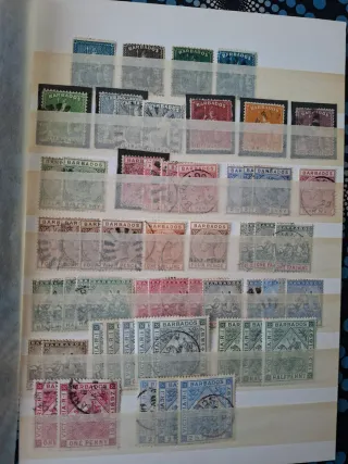 Collezione di francobolli di Barbados. Ripetizioni non conteggiate. - Francobolli con diverse illustrazioni e valori. - Alcuni francobolli presentano la dicitura Barbados. - Diversi francobolli mostrano il ritratto di Victoria R.I.. - Alcuni francobolli sono datati 1897 e 1837. - Valori nominali visibili includono One Penny, Halfpenny, Four Pence, One Shilling, 2 1/2 e 2 1/2 Pence. - I francobolli sono in diverse tonalità di colore, tra cui blu, verde, rosa, arancione e grigio.