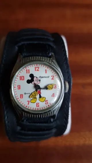 Orologio da polso Ingersoll anni 40.con personaggio di Topolino. In perfette condizioni - Quadrante bianco con numeri rossi. - Immagine di Topolino. - Cinturino nero in pelle.