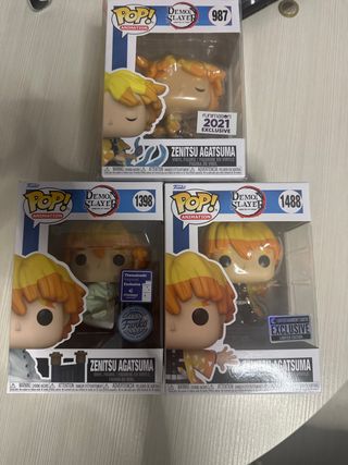 Set di 3 Funko Pop di Zenitsu Agatsuma dalla serie Demon Slayer. - Funko Pop 987 Animation Funimation 2021 Exclusive. - Funko Pop 1398 Animation Thessaloniki Regional Exclusive. - Funko Pop 1488 Animation Entertainment Earth Exclusive.