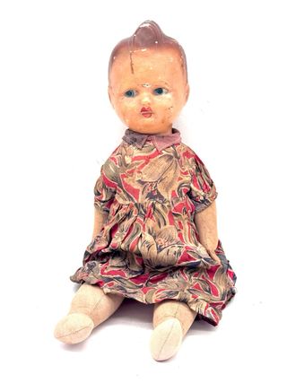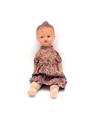 Bambola antica originale con testa in cartapesta dipinta e corpo in tessuto imbottito. Produzione europea risalente al periodo anni 1930–1940 circa. Volto con occhi dipinti e capigliatura modellata. Abito originale d’epoca, coerente per stile e materiali. 📐 Dimensioni • Lunghezza totale: 50 cm 🧾 Condizioni Oggetto autentico d’epoca, non restaurato. Presenta normali segni del tempo: crettature e usure sulla testa in cartapesta, macchie e segni sul tessuto del corpo e dell’abito, come visibile in foto. 🪆 Ideale per collezionisti, arredo vintage, vetrine o scenografia. Non adatta al gioco moderno. Spedizione accurata oppure ritiro a mano.