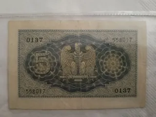 Banconota del Regno d'Italia da 5 Lire. - Biglietto di stato a corso legale. - Ritratto di un uomo in uniforme militare. - Valore CINQUE LIRE ben visibile.