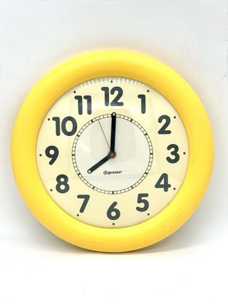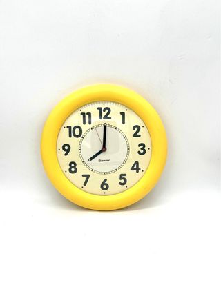 Orologio da parete Guzzini originale d’epoca, produzione italiana anni ’80, dal design iconico e immediatamente riconoscibile. Cornice in plastica gialla, quadrante bianco con numerazione nera ad alta leggibilità. Perfetto per ambienti vintage, modernariato, cucina, studio o arredo pop. 🔧 Dettagli • Marca: Guzzini • Periodo: anni ’80 • Produzione: Italia • Movimento: al quarzo • Alimentazione: batteria (non inclusa) 📐 Dimensioni • Diametro: 31 cm 🧾 Condizioni Buone condizioni generali, con normali segni del tempo coerenti con l’età e visibili in foto. Funzionante.