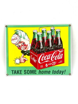 Insegna pubblicitaria Coca-Cola in smalto porcellanato su metallo, grafica storica “Take Some Home Today” con cassetta da 6 bottiglie. Riproduzione ufficiale autorizzata, prodotta negli Stati Uniti con tecnica tradizionale a smalti vetrificati ad alta temperatura (porcelain enamel), come indicato dall’etichetta originale sul retro. Colori vivissimi, superficie lucida, grande impatto decorativo. Perfetta per arredamento vintage, industrial, bar, locali, collezioni Coca-Cola. ⸻ 🔧 Dettagli • Materiale: metallo smaltato (smalto porcellanato) • Produzione: Made in USA • Distribuzione ufficiale: Ande Rooney • Fori originali agli a
