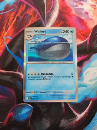 Carta Pokémon Wailord olografica. - Numero carta: 041/159 - Attacco: Idropompa - Debolezza: 4x2 - Resistenza: 1 - Ritirata: 4