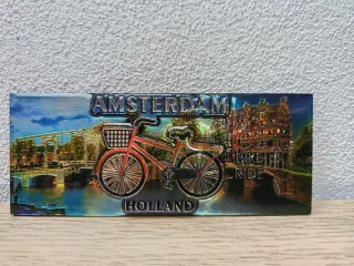 Magneti da collezione con design a tema Amsterdam. - Raffigura una bicicletta rossa con cestino. - Sfondo con canali, ponti e architettura tipica olandese. - Scritte AMSTERDAM e HOLLAND in rilievo. - Dettaglio BIKE RIDE sul lato destro.