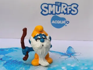 Personaggio dei Puffi in versione safari, con binocolo. Un pezzo da collezione del 2016. - Puffo con abbigliamento da esploratore. - Accessorio: binocolo. - Dettaglio: etichetta Schwäbisch Gmünd alla base. - Logo The Smurfs e Acqua sullo sfondo.