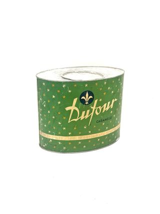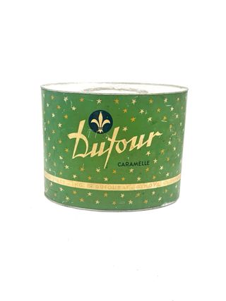 Scatola originale in latta Dufour Caramelle – Genova, storico marchio dolciario italiano. Bellissima grafica verde con stelle dorate e logo con giglio. Grande formato da negozio, molto scenografica e perfetta per arredo cucina retrò, vetrina, bar o collezione di scatole pubblicitarie vintage. 📏 Dimensioni importanti: Altezza 25 cm Lunghezza 31 cm Profondità 20 cm Presente marchio sul fondo “Modello depositato – Marchio registrato” e dicitura G.B. Berruti & C. – Genova. Condizioni originali con segni del tempo, graffi e usura coerente con l’età (vedi foto). Strutturalmente solida. Oggetto autentico d’epoca, non riproduzione.