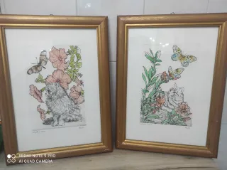 Deliziosa coppia di acqueforti raffiguranti gatti e farfalle.incisioni ( acquaforte) originali dell' artista C.Monti interamente colorati a mano presente certificato di autenticità della galleria Le Muse sul retro di entrambi i quadri misura cm 40/30 con cornici - Cornici dorate. - Stampe colorate e dettagliate.