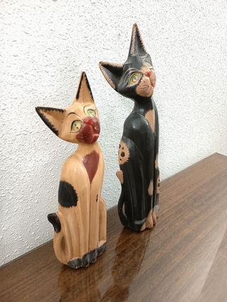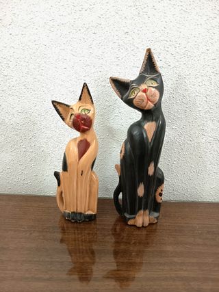 Set di due gatti decorativi in legno. Realizzati in legno, con un design unico e artigianale. Perfetto per aggiungere un tocco speciale alla tua casa. Uno è alto 37 cm e l'altro 30 cm, ciascuno largo circa 8 cm.