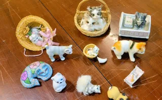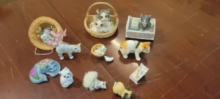 Set di varie figure decorative di gatti. Include gatti in cestini, letti e cappelli. Varietà di design e colori.