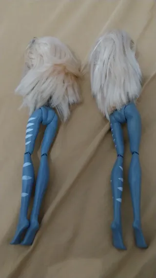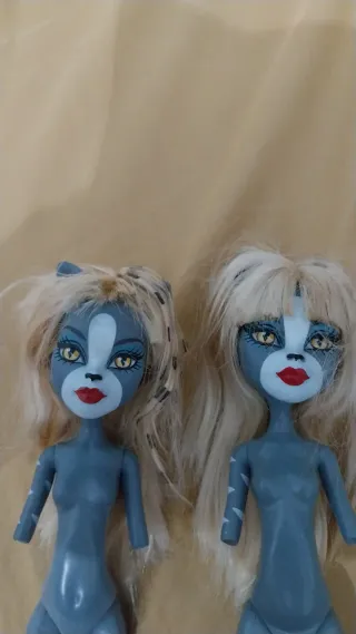 Due bambole Monster High a tema gatto. Corpo di colore grigio. Capelli biondi. Trucco con dettagli da gatto. Come mostrato nella foto