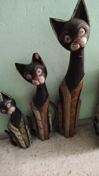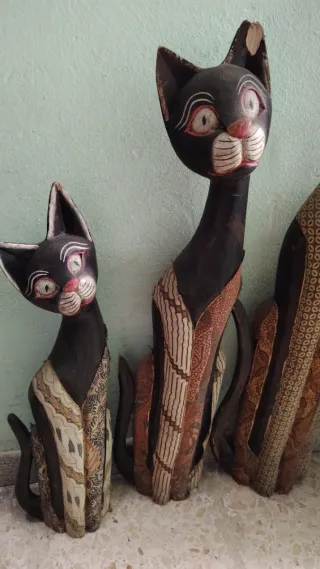 Set di tre figure di gatti intagliate in legno. Ogni gatto ha un design unico e una finitura artigianale. Materiale: Legno. Finitura: Intagliato a mano. Design: Figure di gatti.