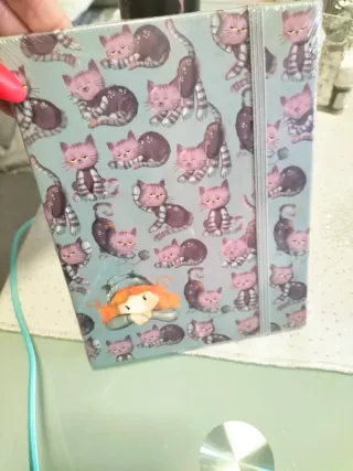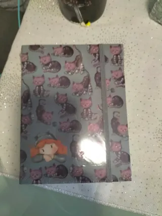 Quaderno con un delizioso design della marca Ninette. Presenta un motivo ripetuto di adorabili gatti e un'illustrazione di una bambina. - Copertina con stampa di gatti. - Illustrazione centrale di una bambina. - Chiusura elastica. Dimensioni: 19 cm di altezza, 14,5 cm di larghezza, 1,5 cm di profondità.