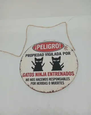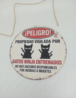 Cartello decorativo con un design divertente e originale. Testo: PERICOLO! PROPRIETÀ SORVEGLIATA DA GATTI NINJA ADDESTRATI. NON CI ASSUMIAMO RESPONSABILITÀ PER FERITE O MORTI. Illustrazione di due gatti ninja con spade. Materiale: Legno. Diametro approssimativo: 15 cm.