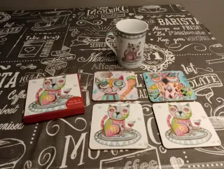 Set composto da una tazza e quattro sottobicchieri con un design unico. - Tazza con disegno di gatto. - Quattro sottobicchieri con disegni assortiti di gatti e gufi. - Design Allen. Completo di scatola per i sottobicchieri