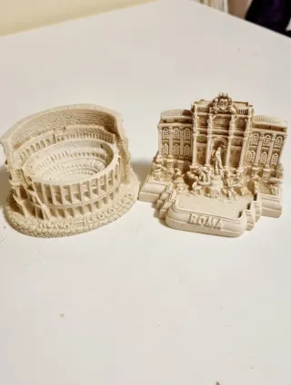 Set di due souvenir di Roma, perfetti per ricordare un viaggio nella Città Eterna. - Riproduzione del Colosseo. - Riproduzione della Fontana di Trevi. - Materiale: resina. - Colore: beige.