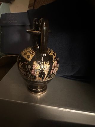 Vaso in ceramica con decorazioni in stile greco. - Altezza: 15 cm - Manici dorati a spirale - Raffigurazioni di figure mitologiche e strumenti musicali