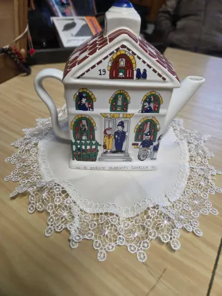 Splendida teiera vintage originale della celebre manifattura inglese Wade Ceramics, serie "English Life". Il pezzo raffigura una tipica stazione di polizia britannica con dettagliati decori fatti a mano (poliziotti,insegne, tetto a tegole). Epoca: Anni '80 / primi anni '90. Stato: Eccellente, senza sbeccature o crepe. Dimensioni: Piccola/Media (ideale per decorazione o collezionismo).Presenta ancora l'etichetta originale del rivenditore italiano dell'epoca.