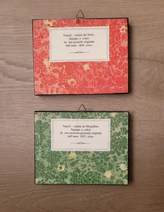 Bellissima coppia di cornici in radica con due stampe raffiguranti vedute di Napoli probabilmente anni 90 Riproducono le stampe con le vedute di Napoli dell'Ottocento: veduta da Mergellina e veduta dal molo. Dimensioni ca. 10 x 12 Una cornice presenta una piccola ammaccatura nel angolo, però non si nota quasi. - Cornici in radica con finitura lucida. - Stampe con scene marine e paesaggistiche. - Ideali per arredare con un tocco classico.
