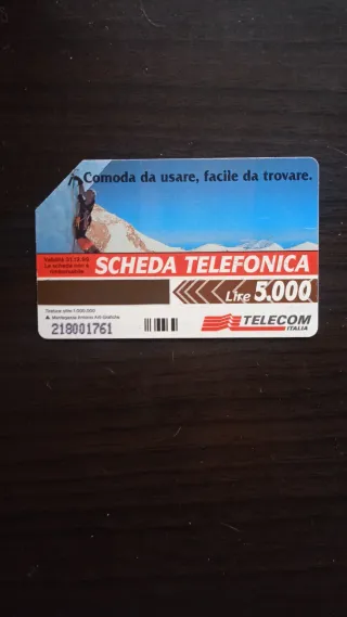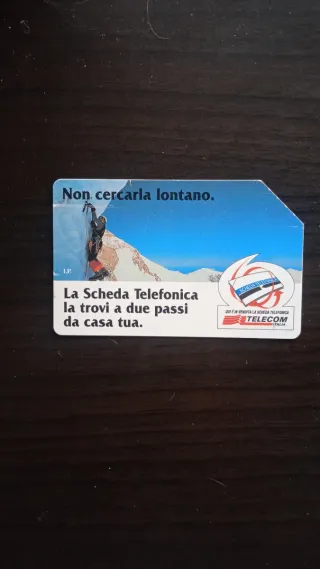 Scheda telefonica Telecom Italia con immagine di un alpinista. - Non cercarla lontano. - La Scheda Telefonica la trovi a due passi da casa tua. - Logo SCHEDA TELEFONICA TELECOM ITALIA