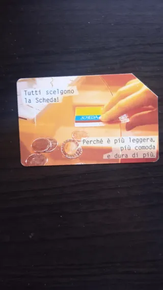 Scheda telefonica Telecom, utile per chiamate. - Design con monete e carta. - Testo: Tutti scelgono la Scheda! Perché è più leggera, più comoda e dura di più.