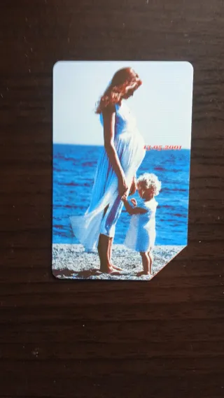 Carta telefonica Telecom con data 13.05.2001. - Immagine di una donna incinta e una bambina sulla spiaggia. - Sfondo del mare e cielo azzurro.
