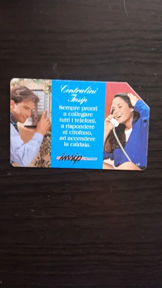 Carta telefonica Telecom Insip con la scritta Centralini Insip. - Testo: Sempre pronti a collegare tutti i telefoni, a rispondere al citofono, ad accendere la caldala. - Logo Insip Telecom.