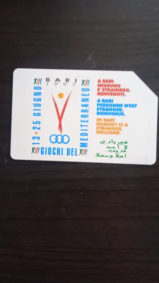 Carta telefonica commemorativa dei Giochi del Mediterraneo del 1997 a Bari. - Edizione speciale per l'evento. - Design con logo dei giochi e scritte multilingue.